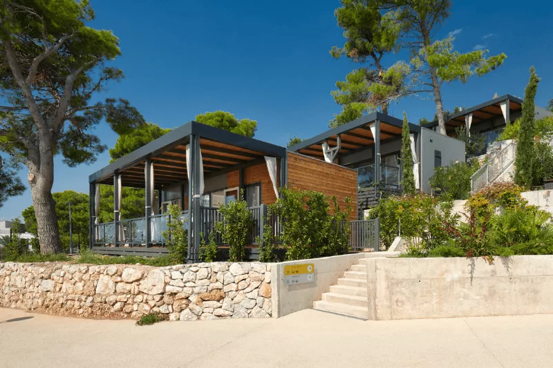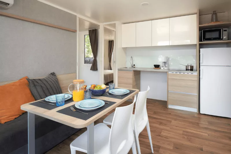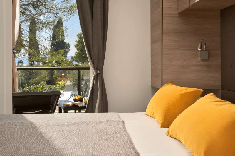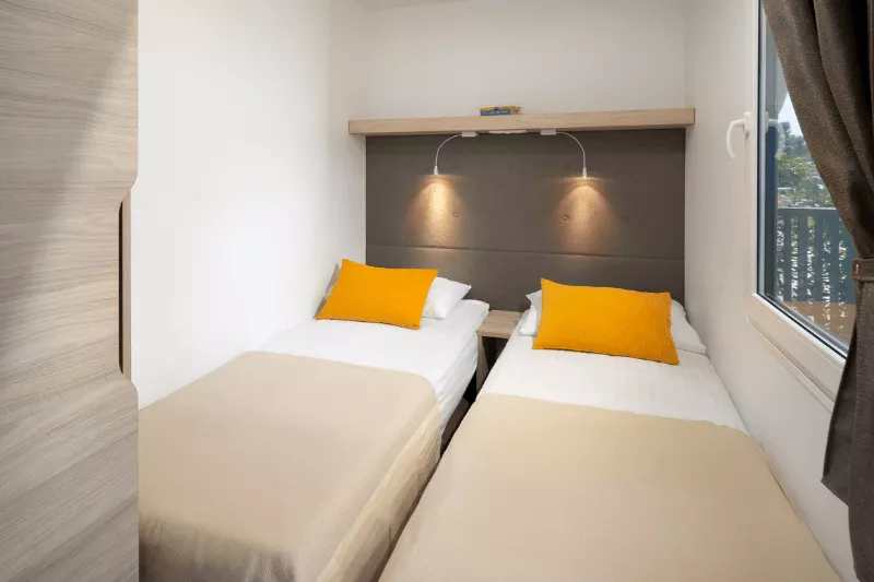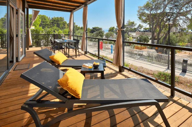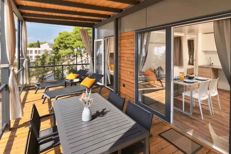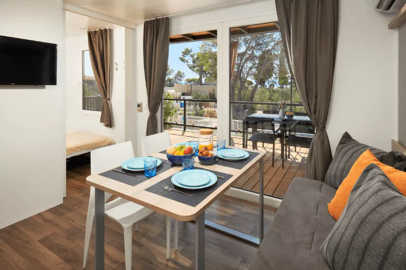 Ova mobilne kućice u potpunosti je prilagođena osobama s invaliditetom. Sastoji se od spavaće sobe s bračnim krevetnom, spavaće sobe s dva odvojena kreveta, dnevne sobe s dodatnim ležajem, te kuhinje i kupaonice. Opustite se na prostranoj terasi s ležaljkama i pogledom na Jadransko more, a moderne pogodnosti unutar kućice poput klimatizacijskog uređaja, televizora i besplatnog Wi-Fi-a omogućit će vam bezbrižno uživanje u prekrasnoj Podgori.